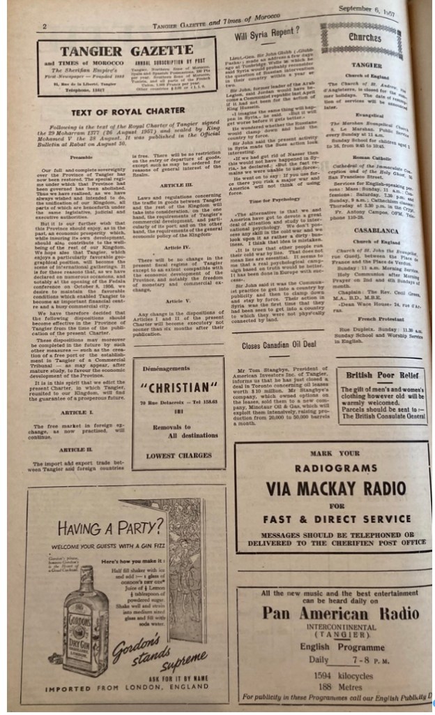Image 1. Tangier Gazette, p2, edition 6 September 1957, as found in the archives of the American Legation Tangier.